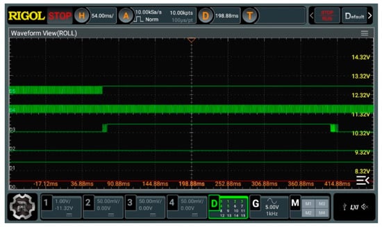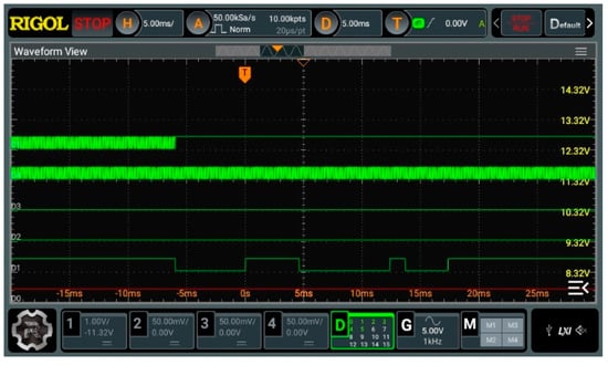 The connection method for the logic channel of the oscilloscope is maintained as described in Section 4.3. The LED lighting brightness change is triggered manually using a switch. The switch output is used as the trigger source for the oscilloscope, and the waveform is depicted in Figure 23.