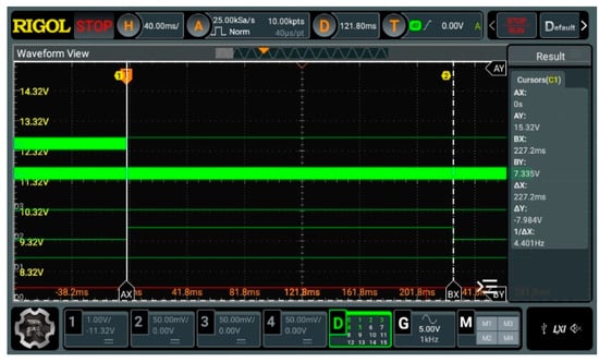 The oscilloscope logic channel connection method in Section 4.3 is maintained. Moving the human body to effectively trigger the infrared sensing circuit, using the output of the infrared sensing circuit as the oscilloscope trigger source, and capturing the waveform with a single trigger as shown in Figure 22 should be performed. Upon waveform observation, it is evident that when the PIR sensing circuit is triggered, a high-level pulse is generated and maintained for a period of time before returning to the low level. Using the oscilloscope cursor measurement, it can be seen that the duration of the high level is approximately 227 ms, which is consistent with the design value of 230 ms. The use of the dedicated integrated circuit BISS0001 allows for clear visibility of rising and falling edges without jitter.