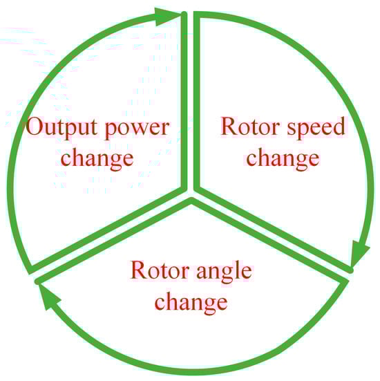 The capability of a power grid system to establish restoring forces that are equal to or greater than its disturbing forces, in order to ensure an equilibrium state, is termed power system stability [22,23]. The three basic types of power system stability are voltage stability, frequency stability, and rotor angle stability. In recently integrated power grid systems, converter-driven stability and resonance stability types have been observed [1]. Rotor angle stability involves electromechanical oscillation damping and control, which is a natural phenomenon in synchronous generators. Electromechanical oscillations are caused by imbalances between the electrical and mechanical sections of the synchronous generators, in which the generated (output) power changes with respect to the synchronous generator’s rotor speed and rotor angle. These sequential events involving the rotor speed, rotor angle, and output power account for the electromechanical oscillations in a power grid system. Figure 1 shows this sequential event, which shows that changes in the rotor speed lead to changes in the rotor angle and power output.
