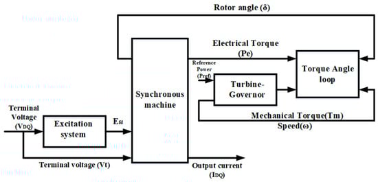 From the solution loop diagram in Figure 3, the synchronous generator itself is the remaining part of the model, and is divided into the electrical torque (), the stator current components in the symmetry axis (dq), the symmetry axis (dq) damper coil flux linkage due to the transient EMF in the field, and the symmetry axis (dq) damper flux coil linkage due to the sub-transient EMF in the field. Equation (4) can be used to express the electrical torque. Equation (5) represents the stator current component’s symmetry axis (dq) in the q-axis, and Equation (6) shows it along the d-axis. The symmetry axis (dq) damper coil flux linkage due to transient EMF in the field is described in the q-axis by Equation (7), and in the d-axis by Equation (8). The symmetry axis (dq) damper flux coil linkage due to the sub-transient EMF in the field in the d-axis is expressed in Equation (9) and in the q-axis in Equation (10).