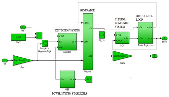 The voltage in the dq frame is transformed using Equation (11) to the DQ frame; likewise, the current from the generator is also transformed using Equation (12) to the network DQ frame. Equations (1)–(12) are coupled together, as shown in the schematic diagram of Figure 3, into a Simulink model that represents the conventional power test system model shown in Figure 4.