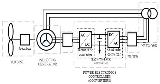 Recently, there has been massive integration of renewable energy sources into power grid systems to meet energy demands and decarbonize power grid systems. These renewable energy sources include biomass, solar, geothermal, wind, and hydrogen energy. However, wind and solar renewable energy sources are growing rapidly in terms of their integration and development [1,2]. Wind energy is generated through a wind energy conversion system (WECS), in which a wind turbine is connected to a generator. Based on the wind turbine’s rotational speed, a WECS can be classified as either a constant- or variable-speed wind turbine system [3]. For the constant-speed wind turbine system, the turbine is connected to an induction generator with a squirrel-cage rotor; the squirrel-cage induction generator has a simple operation, and its major limitation is the inability at varying wind speeds to extract maximum wind energy owing to small variations in slip range. Technological advancements in wind energy development have led to variable-speed wind turbines, which can extract maximum wind energy at varying wind speeds [4]. The most common among them is the doubly fed induction generator system (DFIG), which directly connects its stator to the grid while the rotor current is fed to the grid through power electronics converters (AC/DC–DC/AC) [5,6]. The DFIG-WECS not only offers high power output efficiency despite variations in rotor speed from varying wind speed, but also improves the power factor and power quality by either absorbing or generating reactive power; this makes the system attractive for wind energy conversion systems [7].