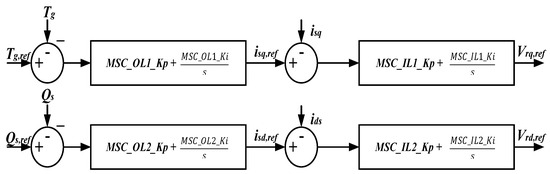 - The power electronics converters: The systems developed so far either represent the mechanical or electrical subsystems of the DFIG power test system. They are quite different from the controllers or converters in the sense that the converters are power electronics converters that contain microcontrollers that are run by some software codes. The power electronics converters include the machine-side and the grid-side converters. The controllers adopted in this study have a simple two cascaded proportional integral (PI) model. The machine-side converter receives voltages, generator rotor speed, and current in the form of electrical signals, and produces corresponding switching signals for the converter. The block diagram of the machine-side converter is shown in Figure 6.
