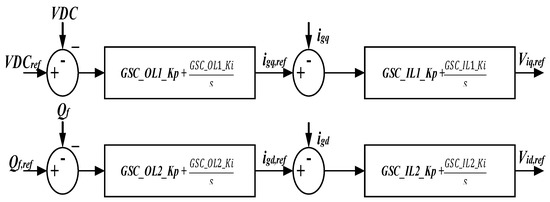 Like the machine-side converter, the grid-side controller also has two cascaded proportional integral (PI) controllers regulating the voltage capacitor and reactive power flow from the grid side at the wind turbine generator bus. Rotor power is transferred to the grid by regulating the capacitor voltage reference value. The block diagram representation of the grid-side converter is shown below in Figure 7.