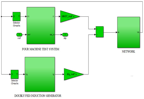 The conventional multimachine (Kundur’s IEEE) power test system model in Figure 4 and that of the DFIG-WECS in Figure 8 were integrated into a DFIG-WECS IEEE Kundur’s IEEE integrated power grid system, as shown in Figure 9. The bus selector blocks (Smachs and Dmachs) specify the numbers of buses.