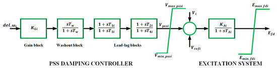 Electromechanical oscillations occur instantaneously in power grid systems. Hence, automated damping and detection schemes, such as a PSS damping controller, are important in power grid systems. The PSS damping controller, when operated as a compensator for the excitation system, compensates for the input phase lag error between the electrical and mechanical torque components of the generator rotor system [24]. The PSS damping controller, when introduced into a power grid system, also adds an extra input signal to the excitation system of the synchronous generator. It acts as a synchronizing torque that phase locks a synchronized torque signal onto the generator’s speed deviations. This operation improves the stability of the power grid system, and damps the electromechanical oscillations. This study adopted the lead-lag PSS damping controller, as shown in Figure 10, which is mathematically expressed in Equation (26).