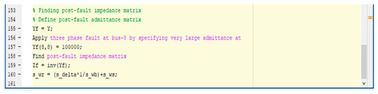 The power system is composed of various dynamic elements, and is modeled using mathematical DAEs, as shown in the power test system models. These power system DAEs are solved using the ODE solver in MATLAB/Simulink software. It is important to note that the power system model is a non-linear system with constant changes in load flow, power generation, impedances, reactances, and other power flow parameters. However, the PSS damping controller is designed based on the linear control theory; thus, the non-linear power system is linearized about an operating point. For research purposes, a fault was integrated into the Simulink model in Figure 9, by specifying an impedance of zero at Bus 8 from the bus to the ground. A large admittance was added at the diagonal entry that corresponded to the bus in the admittance matrix, and thus the inverse of the new admittance matrix was obtained which gave a post-fault impedance matrix. A screenshot of the program is shown in Figure 11.