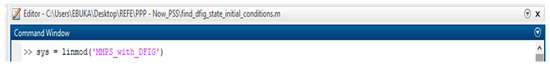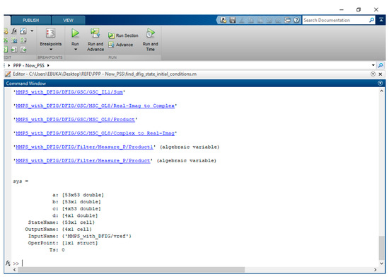 In a faulty operating condition, the power system was linearized using a code on the Matlab Integrated Development Environment: [A, B, C, D] = linmod(‘system file name’) or sys = linmod(‘system file name’). Our system file was named MMPS_with_DFIG.slx; however, when inputting the code, the .slx is omitted and represented as sys = linmod(‘MMPS_with_DFIG’). A screenshot of the procedure is shown in Figure 12.