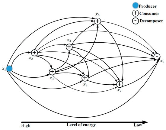 The producer in Figure 15 is the worst individual , because it is assumed to have the highest objective function value (high energy), and the best individual is the decomposer (), which is assumed to have the lowest objective function value (least energy). The others are consumers, and it is assumed that () are herbivores (animals feeding on plants only), () are omnivores (animals feeding on both plants and animals), and () are carnivores (animals feeding on animals only).