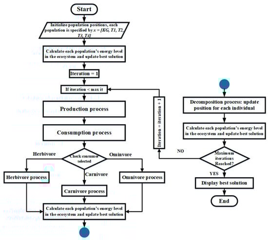 The study in reference [27] developed artificial eco-system optimization, which is a metaheuristic algorithm inspired by nature. The AEO algorithm mimics production, consumption, and decomposition operations, which are three unique behaviors of living organisms in an ecosystem. An ecosystem is defined as the complex behavior of living organisms and the inter-relationships in their physical environment within a specific region of space. The two classes of ecosystems are abiotic (sunlight, water, and non-living elements) and biotic (all living elements). As per the metaheuristic algorithm, the AEO search procedure is based on two important features: exploration and exploitation. The production operation enhances the exploitation and exploration balance, the consumption operation improves the exploration ability of the algorithm, and the decomposition process improves exploitation in the algorithm. In a population, every organism’s energy level is accessed based on the defined objective function, and the objective function values are then used to sort individuals in the population into descending order. An individual from the population with the highest objective function value indicates the highest energy level, which forms a minimization problem for optimization. The mathematical modeling of the AEO algorithm is detailed in reference [27]. As previously mentioned, there are three behavioral processes in an ecosystem: production (producer), consumption (consumers are omnivores, carnivores, and herbivores), and decomposition (decomposer). It is assumed that in an ecosystem, there exists only one producer as an individual, and in the population, only one decomposer exists as an individual, as shown in Figure 15. Consumers represent the rest of the population of the ecosystem.