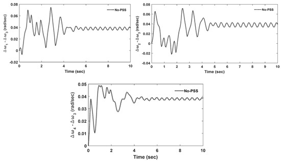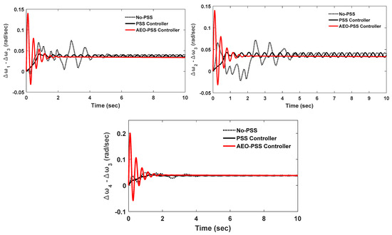 These optimized PSS damping controller parameters were used for time domain simulations in the power test system, in order to control and damp the oscillations. The rotors’ speed responses of the synchronous generators to the installed PSS damping controllers, in comparison with the uncontrolled synchronous generator rotors’ speed responses, are shown in Figure 21.