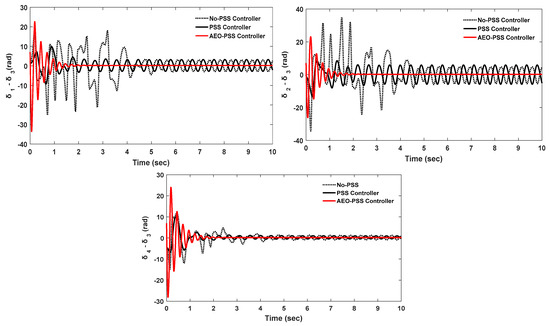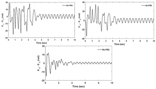 As already mentioned, controlling the synchronous generator’s rotor speed change leads to control of the synchronous generator’s rotor angle, as explained in the sequential events of electromechanical oscillations; thus, with control over the rotor speeds of the synchronous generators, the rotor angles of the synchronous generators are controlled as well. Figure 22 shows a comparison of the rotor angles of the controlled and uncontrolled synchronous generators.