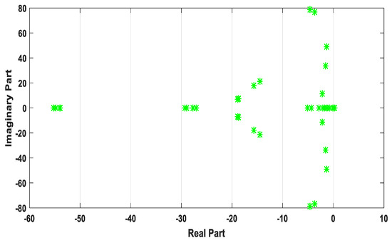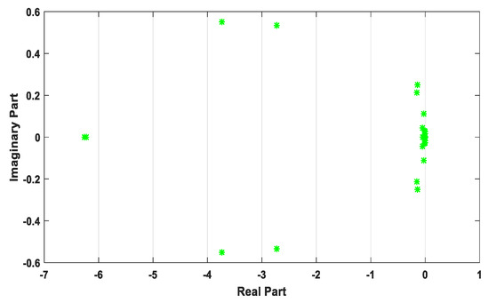 As seen from Table 4, all of the eigenvalues have negative real parts, which means that they all appear on the plane’s left-hand side, indicating that the power test system is stable. In particular, Mode 13 was moved to the plane’s left-hand side compared with what is shown in Table 2, with a damping ratio of 0.6075. The eigenvalue plots in Table 4 are shown in Figure 23.