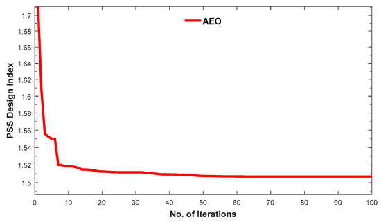 To control these electromechanical oscillations and move the unstable mode to the left side of the plane, PSS damping controllers were installed in synchronous generators 1, 2, and 4 of the power test system. For optimal performance, the AEO algorithm was adopted in designing the damping controllers, and it provided the parameters . In total, 15 parameters were optimized (i.e., 5 for each PSS damping controller). The obtained parameters are listed in Table 3. The optimization curve, which shows the point of convergence to the optimal solution, is shown in Figure 20.