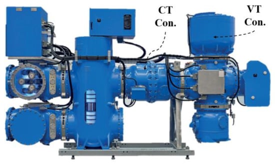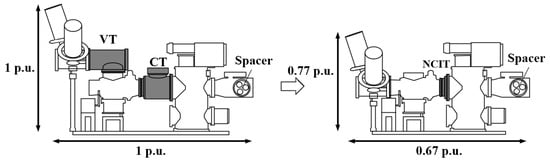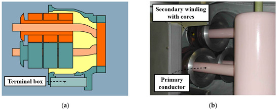 ITs for gas-insulated switchgears (GISs) consist of voltage transformers (VTs) and a current transformer (CT), and transformer designs suitable for GISs have been employed to measure voltage and current in power systems since 1966 [3,4]. Unlike air-insulated switchgears (AISs), GISs use sulfur hexafluoride (SF6) as an insulating gas, allowing higher insulation performance and compact design. Inductive voltage transformers (IVTs) and inductive current transformers (ICTs) are installed in separate tanks filled with SF6, overcoming the limitations of conventional transformers [5,6,7]. However, in IVTs and ICTs, volume, weight, insulation performance, and cost increase proportionally with voltage levels. The core becomes magnetically saturated due to excessive primary voltage and high current, resulting in low accuracy and distorted signals in the secondary output. For this reason, it is difficult to collect power-quality measurements (PQM) within such power systems [8]. Despite these disadvantages, IVTs and ICTs widely used in GIS are expected to provide high accuracy under normal load conditions and endure repetitive vibrations, overloads, and short-circuit conditions associated with switching operations [9].