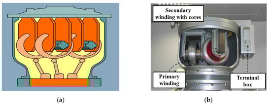 Three-phase VT in GIS enclosure: (a) Cross-sectional diagram [53]; (b) Photograph [54].