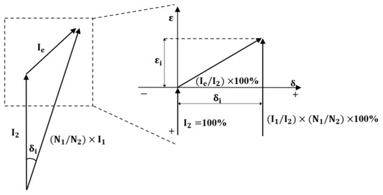 Herein, the secondary current of is chosen as the reference vector and set to 100%. is the voltage ratio error, and is the phase displacement between the primary and secondary voltages. When the secondary current is higher than the rated transformation ratio, it is positive, and when the phase of the secondary current leads the phase of the primary current, the phase displacement is expressed as positive.