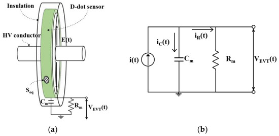 Principle of D-dot sensor for typical EVT: (a) Conceptual structure; (b) Equivalent circuit.