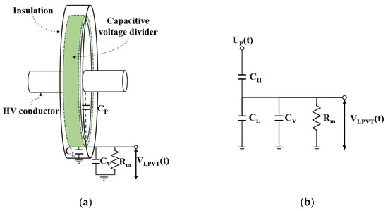 IVTs installed in GISs have a direct electrical connection between the primary high and secondary low voltages, making them susceptible to insulation breakdown during operation due to transients. Furthermore, the LC resonance phenomenon can occur when a breaker opens at the termination of the main system [68]. This phenomenon involves a combination of capacitive reactance, caused by the charge capacity between each pole and ground, and inductive reactance, induced by the voltage in the main system [69]. When these factors are combined in series, it can result in high commercial frequency overvoltage, potentially leading to insulation breakdown in the GIS. To address this issue, EVTs according to IEC 60044-7 were introduced. An EVT is designed for voltage measurement while maintaining electrical isolation between the high- and low-voltage sides based on the D-dot principle using Gaussian laws [70,71]. Figure 8 shows the structure and equivalent circuit of a D-dot sensor applied to a typical EVT.
