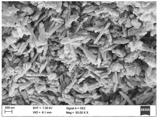 The structure and morphology of the powders were examined using a high-resolution scanning electron microscope (HRSEM). The examinations were conducted using a Supra 35 scanning electron microscope from Zeiss (Jena, Germany) with an accelerating voltage of 20 kV and magnifications ranging from 100× to 50,000×, equipped with an X-ray detector with energy dispersion (EDS), model EDX UltraDry from Thermo Scientific™ (Waltham, MA, USA). The powders intended for the study were coated with a layer of gold approximately 15 nm thick to dissipate the electric charge.