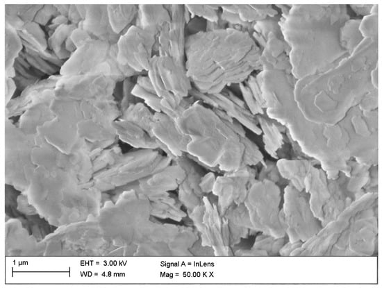In this work, three commonly occurring, natural aluminosilicate minerals were selected to serve as fuel additives: kaolin, halloysite, and bentonite. The additives are materials of the clay category whose characteristics and applications were elaborated in detail in []. The scanning electron microscope (SEM) pictures of halloysite, kaolin, and bentonite used in this investigation are presented in Figure 1, Figure 2 and Figure 3.