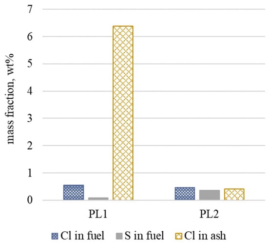 As presented in Section 2.1, a higher sulfur content in the fuel can contribute to reducing the chlorine content in the ashes. This analogy is illustrated by the analysis of Figure 4. Fuel PL1 with a high Cl/S ratio shows significant chlorine content in the ash—above 6%. Fuel PL2, with a similar chlorine content but a significantly higher sulfur content, has a much lower Cl/S ratio, which results in a much lower chlorine content in the ash, not exceeding 0.5%.