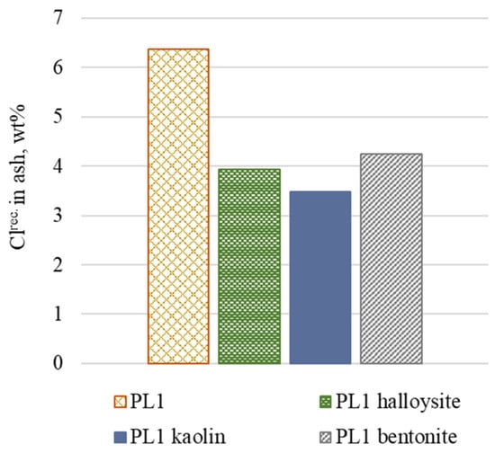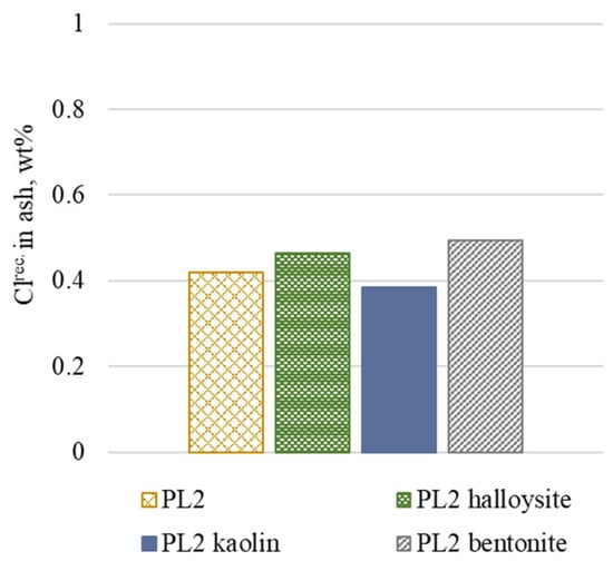 For the PL2 ash, whose initial chlorine concentration is significantly lower, the influence of additives is not clear. In the case of kaolin, a reduction of 8.67% is observed, whereas bentonite and halloysite have no positive effect. Two factors are likely to cause the absence of a clear chlorine reduction. First is the high ash content in PL2 (48.9%), which results in the dilution of the reagents, causing unfavorable conditions for the reactions to occur. Second is the already low chlorine content in the PL2 ash (0.42%), which is a result of the chlorine sulfation reactions taking place during the incineration phase.