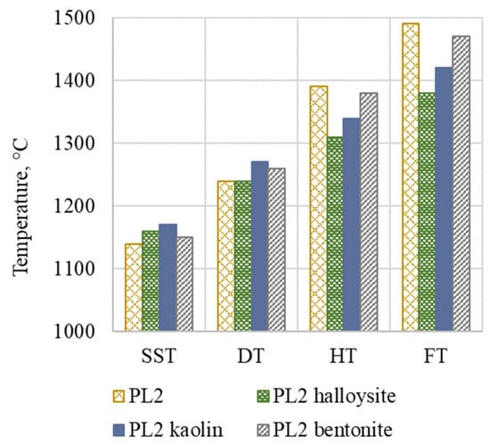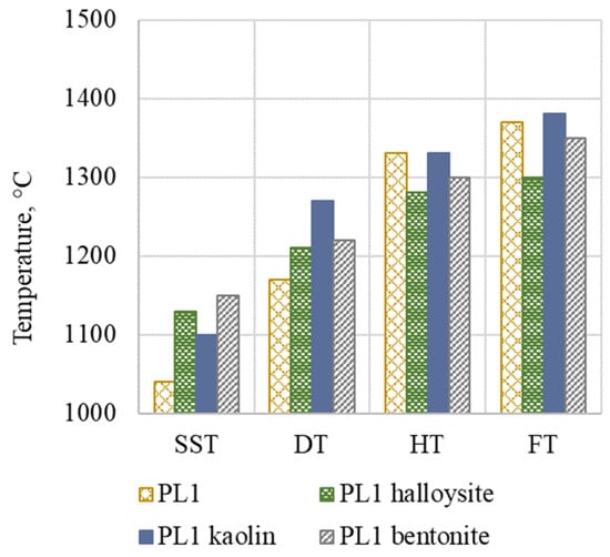 For the PL1 ash, whose shrinkage starting temperature and deformation temperature values are lower than those of the PL2 ash, the presence of additives elevates them. However, the performance of additives in the case of the PL2 ash is not clear, but, what needs to be emphasized is that the SST and DT temperatures of PL2 are already high and comparable to those of coal. No positive change in the hemisphere temperatures and flow temperatures of both the PL1 and PL2 ashes can be observed. These tendencies are in line with other research on the influence of aluminosilicate additives on the AFT of various fuels, where, in the case of low-melting biomass ashes, the clear positive influence was observed by Sobieraj et al. [], but no clear positive influence was determined in the case of the coal ashes with AFT temperatures exceeding 1100 °C tested by Wang et al. []. Therefore, it can be concluded that the performance of additives is particularly effective in the conversion of fuels with low melting temperatures.