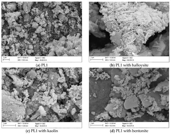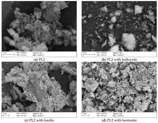 Figure 9 depicts the PL1 ash with additions of halloysite, kaolin, and bentonite. In comparison, the PL2 ashes appear to be more heterogeneous and irregular, with partially idiomorphic crystalline particles, small platelets, and minute granules in clusters (Figure 10a).