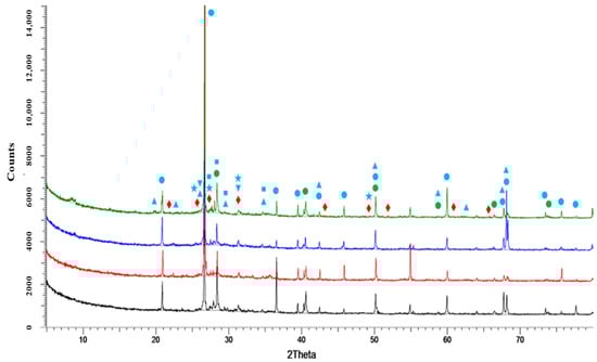 These latter rearrangements, of course, may be allocating the potassium ions coming from chlorides melting or yielding other crystalline species typical of thermal treatments of biomasses. Those crystalline arrangements are able to coordinate and host the K+ ion in silicate lattices, in between layered structures, in channeled radicals, or by anionic radicals, which could be favored in the range of reached temperatures listed in Table 4. Overall, the XRD analysis would confirm the interaction between ashes and additives.