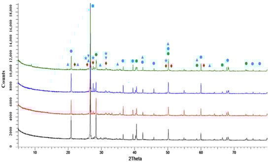 The X-ray diffraction (XRD) patterns of the investigated samples are presented in Figure 11 and Figure 12 together with the main detected phases listed in Table 5.