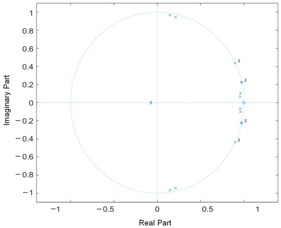 In this subsection, the closed-loop pole map of the LCL-filtered GCI system controlled by the proposed incomplete state feedback control is presented. To demonstrate the performance and robustness of the proposed scheme, all the eigenvalues of the matrix in (39) should lie inside the unit circle. Figure 2 represents the stability analyses when the grid impedance exists as an uncertain L-type with of 7 mH. Figure 3 represents the stability analyses for the complex grid setup, in which a grid inductance and a grid capacitance are selected as 3 mH and 10 µF, respectively. It is clear from Figure 2 and Figure 3 that even if the GCI system is faced with L-type or LC-type grid impedance, all eigenvalues are maintained inside the unit circle. These results effectively prove the stability of the LCL-filtered GCI controlled by the proposed incomplete feedback control scheme.