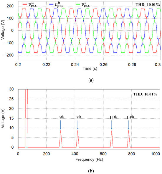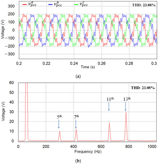 In the first test, the GCI is connected directly to the main grid without the existence of grid impedance. The three-phase distorted PCC voltages (same as the grid voltages in this case) are presented in Figure 4a with low-order distortion harmonics at the 5th, 7th, 11th, and 13th. The FFT analysis of a-phase PCC voltage in Figure 4b clearly highlights that the contaminated harmonic level of each component is set to 5% of the fundamental grid voltage magnitude, which produces the total harmonic distortion (THD) level of grid voltage to be 10.01%.