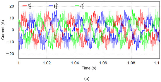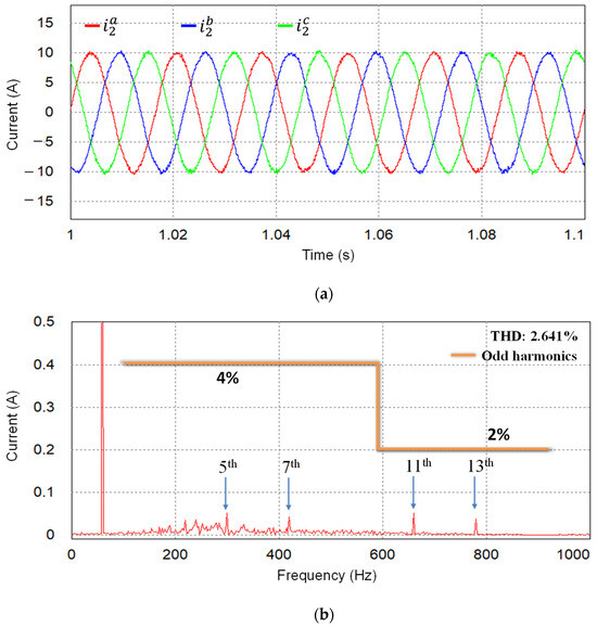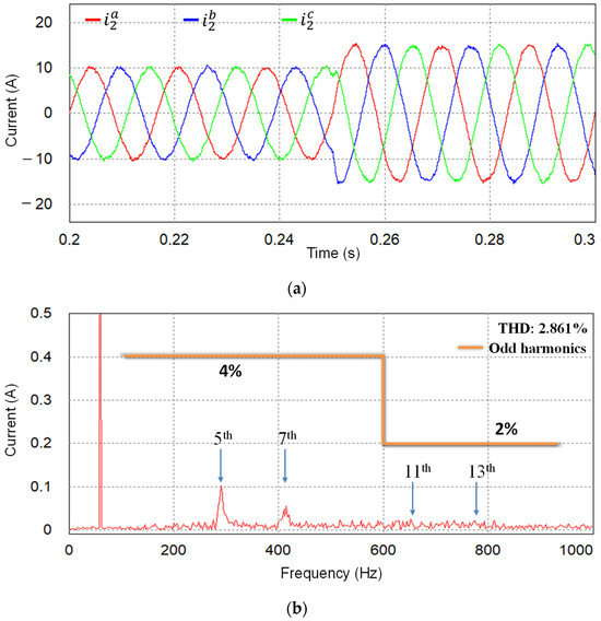 Under the stiff and distorted grid conditions, the grid-side current response of the proposed current controller is presented in Figure 5a. By means of the proposed controller, stable and high-quality grid-side currents can be produced in steady-state with a low THD level of 2.861%. The test result also demonstrates the effectiveness of active damping action realized by the state feedback controller and the harmonic compensation by resonant control terms augmented inside the controller. To verify the transient response, the grid-side current reference is changed from 10 A to 15 A at 0.25 s. The rapid reference tracking performance without any overshoot clearly shows a stable operation of the GCI controlled by the proposed control. The FFT result of grid a-phase current in Figure 5b also confirms that the individual harmonic distortion in grid-side current is maintained to be lower than the maximum limits specified in the IEEE Std. 1547-2003 [3] for a GCI system.