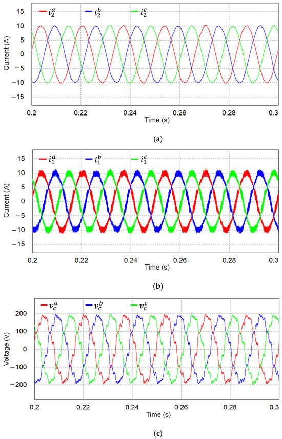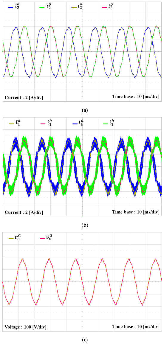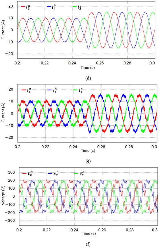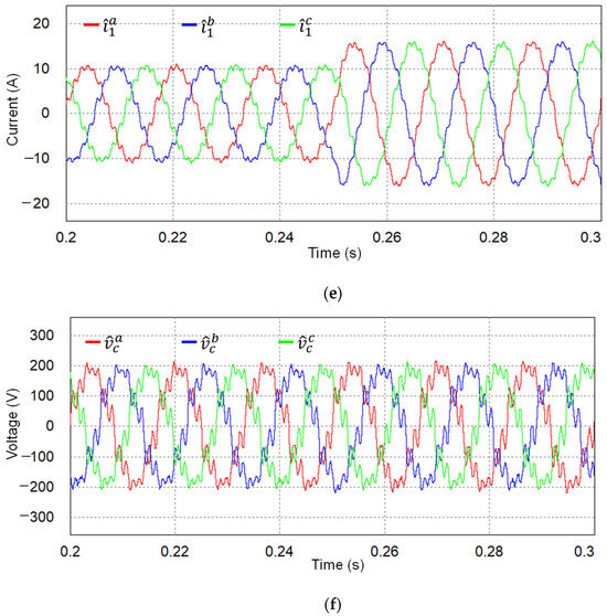 It is worth mentioning again that the proposed control scheme is realized by using only the measurement of the DC-link voltage (VDC), grid-side currents, and PCC voltages. Additional state variables, such as inverter-side current and capacitor voltages, are estimated to construct the proposed state feedback control. To validate the estimating performance of the observer, the simulations are conducted under the same complex grid as in Figure 6. Figure 8a shows the measured and estimated grid-side currents in SRF, in which the estimated state variables track the measured ones exactly. The estimated and measured quantities of inverter-side currents and capacitor voltages are shown in Figure 8b,c, respectively, in which only small steady-state errors are maintained. Thanks to the good performance of the observer, the proposed scheme can produce high-quality grid-side currents and stable operation even under severe grid conditions without the requirement to install full sensing devices. To visualize the estimated state variables in three-phase waveforms, those estimated quantities produced by the observer in SRF are transformed to the natural reference frame as presented in Figure 8d–f. These figures represent the estimated three-phase grid-side currents, inverter-side currents, and capacitor voltages, respectively.