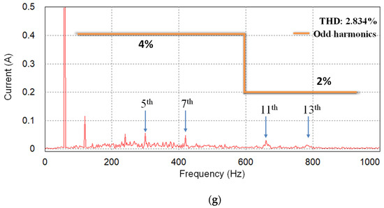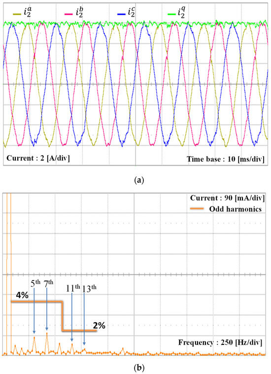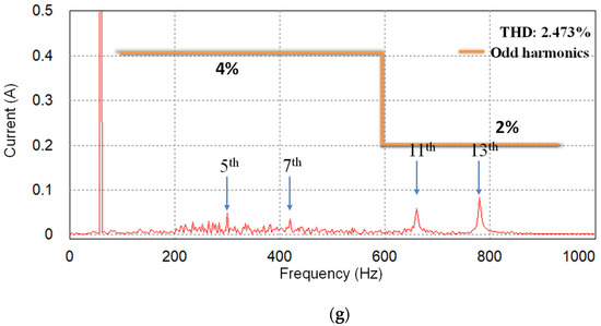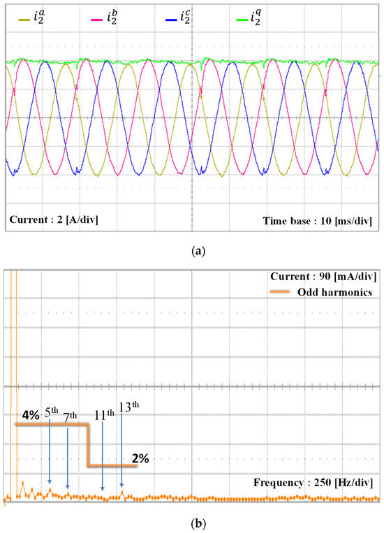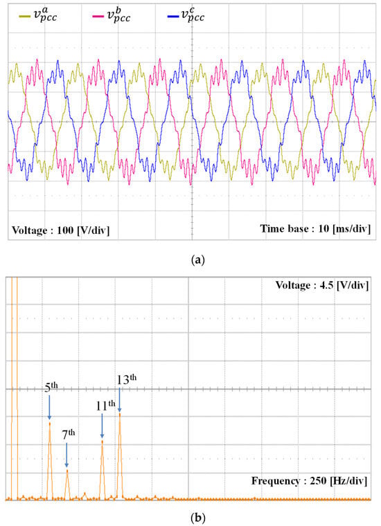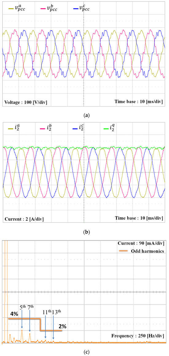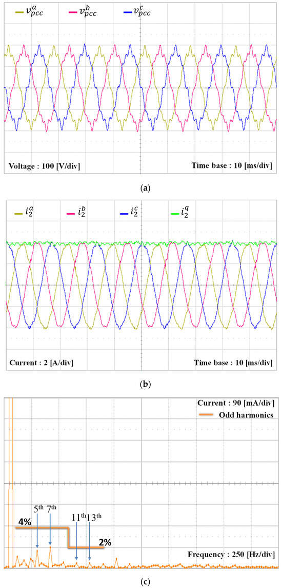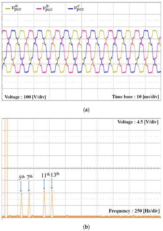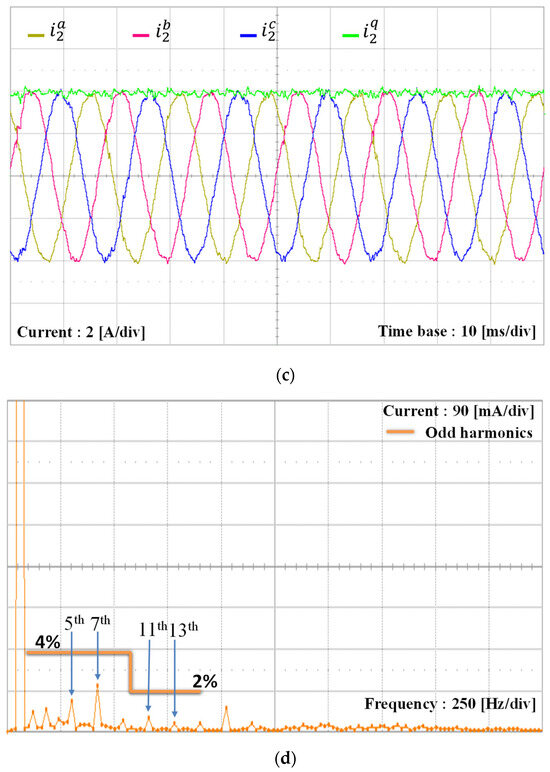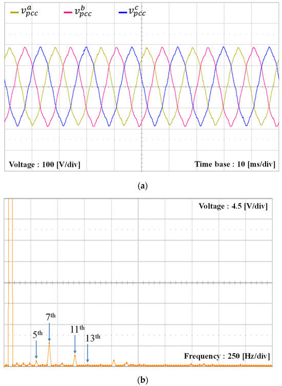 To verify the alignment between the simulation and experimental results of the proposed scheme under the L-type grid impedance, the grid inductance is increased to 7 mH, which is similar to the simulation setup in Figure 9. Due to the increase of the grid inductance, the PCC voltages are distorted further by increased magnitudes of low-order harmonics, as shown in Figure 20a. As shown in Figure 20b, the harmonic components in the orders of 5th, 7th, 11th, and 13th are 6.9%, 2.5%, 5%, and 7.5% of the fundamental grid voltage magnitude, respectively. Even under such severe conditions, three-phase grid-side currents of the GCI controlled by the proposed scheme in Figure 20c,d show high-quality grid-injected currents similar to Figure 9.