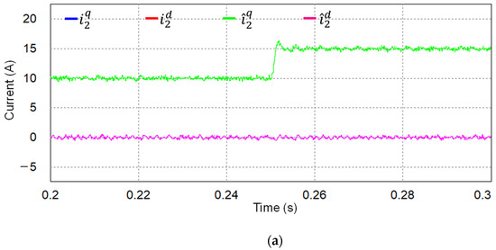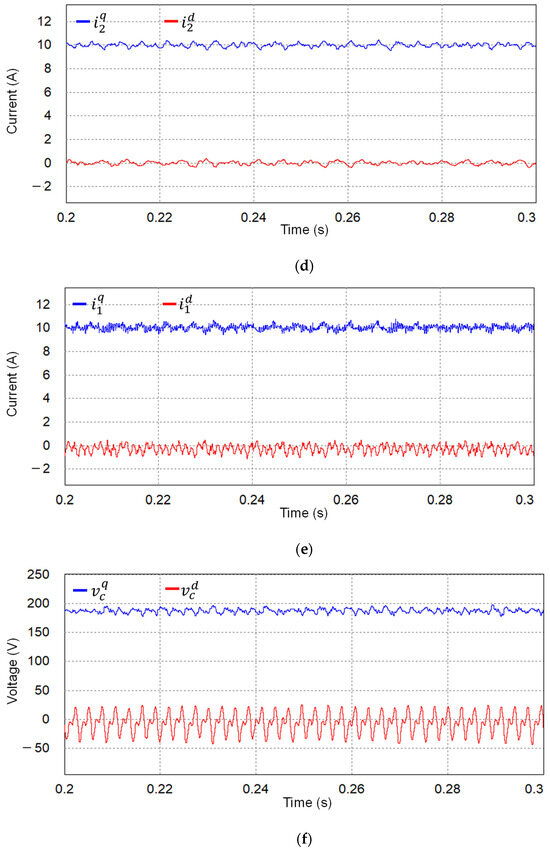 where the superscript “q” and “d” denote the q-axis and d-axis. Also, , are the inverter-side current, the grid-side current, and the grid inductance current; is the angular frequency of grid voltage.