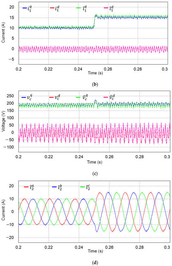 Simulation results for estimating performance of discrete-time observer when is 3 mH and is 10 µF under q-axis current reference change at 0.25 s. (a) Grid-side currents and estimated states at SRF; (b) Inverter-side currents and estimated states at SRF; (c) Capacitor voltages and estimated states at SRF; (d) Estimated three-phase grid-side currents; (e) Estimated three-phase inverter-side currents; (f) Estimated three-phase capacitor voltages.