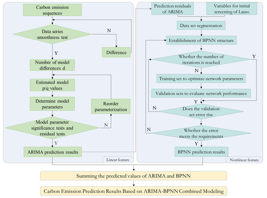 In order to overcome the limitations of a single model, the ARIMA model and the BPNN are combined to give full play to the ARIMA model in fitting linear sequences and to the strong nonlinear mapping ability of the BPNN and thus improve the final prediction accuracy. As shown in Figure 2, the ARIMA model is first used to predict the carbon emissions, with the influencing factors obtained from the initial screening of the Lasso regression as the input variables for the BPNN model. The BPNN is used to predict the residual sequence of the ARIMA model, and the outputs of the two models are added as the final results on the carbon emissions, which can more accurately predict future carbon emissions.