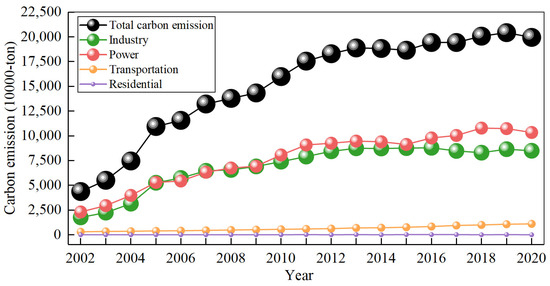 The carbon emissions generated by energy consumption in the industrial sector, the electric power sector, the transportation sector, and the residential sector above a designated size in Suzhou from 2002 to 2020 represent the overall carbon emissions generated in Suzhou for the subsequent estimation. The electric power sector is generally classified as industrial in principle; with a relatively large amount of carbon emissions, its accounting is a bit different from that for other types of energy. Therefore, independent accounting is required for the power sector. The construction sector is also an important sector for carbon emissions. However, due to the fact that the carbon emissions generated by the construction sector mainly come from building material production and the transportation of and construction with building materials, the energy consumption of building material production is covered in the industrial sector, building material transportation is covered in the transportation sector, and building operation power consumption is included in the power sector accounting. The carbon emissions generated by construction are relatively small and almost negligible [32]. To avoid duplicate calculations, this study will no longer calculate the carbon emissions generated by the construction sector. The energy consumption data are sourced from the statistical yearbook of Suzhou City. The carbon emission factors of various energy sources mainly refer to the “Guidelines for the Compilation of Provincial Greenhouse Gas Inventories”. Some default values refer to the “2006 IPCC Guidelines for National Greenhouse Gas Inventory” (hereinafter referred to as the 2006 IPCC), and the carbon emission factors for electricity refer to the “Enterprise Greenhouse Gas Emission Accounting Methods and Reporting Guidelines for Power Generation Facilities (2022 Revised Edition)”. Based on the carbon emission factors for various energy sources, the carbon emissions of each department are calculated. The historical carbon emissions are shown in Figure 3. The carbon emission accounting for energy consumption is shown in Equation (3):