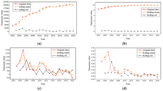 The trend in carbon emissions with the rolling mean and variance in Suzhou from 2002 to 2020 is shown in Figure 4a. The carbon emissions show an upward trend over time, which belongs to a non-stationary sequence. In order to make the sequence stable, the logarithm of carbon emissions is first taken as shown in Figure 4b, and then the original sequence and the logarithmic sequence are differentiated separately, as shown in Figure 4c,d. Then, the unit root test is conducted, as shown in Table 3. After taking the natural logarithm of the carbon emission sequence and differencing it once, the p-value was 0.000001, which was less than the significance level (0.05), and the ADF test value was −5.634789, which was less than the critical value at the 99%, 95%, and 90% confidence levels, so they were judged to be relatively stable using the unit root test. Compared with Figure 4c,d, after one differencing, the data became more stable, and the rolling mean and rolling standard deviation of the data were also more stable. Therefore, first-order differencing was chosen, which is the parameter (d = 1) of the ARIMA model.