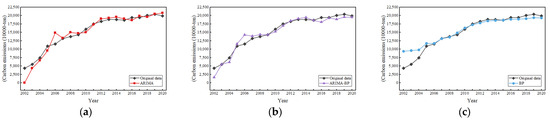 Given that the ARIMA model has been effectively validated for predicting future carbon emissions in the previous part, the training and validation sets will no longer be divided here. Instead, data from Suzhou City 2002–2020 will be directly used as the samples to fit the ARIMA model. The prediction results are shown in Figure 6a. It is seen that the ARIMA model’s accuracy in predicting carbon emissions is not satisfactory, but the trend is consistent, indicating that the model grasps the information on the linear part of carbon emissions.