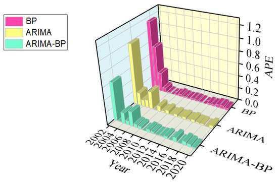 It can be seen from Figure 7 and Figure 8 that the error of the BPNN fitting results is the largest. Compared with the single model, the error of the ARIMA-BPNN combined model is reduced. As depicted in Figure 7, the APE of the ARIMA model ranges from a minimum of 0.003580 to a maximum of 0.99, with a mean of 0.115. The APE of the BPNN model ranges from a minimum of 0.00080 to a maximum of 1.15, with a mean of 0.123. The APE of the combined ARIMA-BPNN model ranges from a minimum of 0.000758 to a maximum of 0.62, with a mean of 0.081. All these indicators of the combined model are smaller than the single model. Additionally, the standard deviations of the APE of the ARIMA model, the BPNN, and the ARIMA-BPNN combination model were calculated to be 0.23, 0.30, and 0.14, respectively, indicating that the stability of the ARIMA-BPNN model surpasses that of the single model.