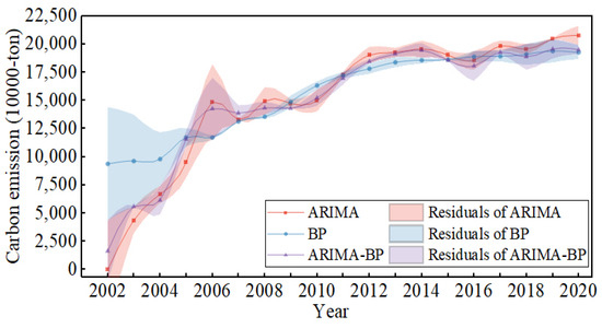 - Based on the historical data of Suzhou City from 2002 to 2020, the single (ARIMA, BPNN) model and the ARIMA-BPNN combination models were established, respectively. Based on the fitting results, the ARIMA-BPNN combination model has a higher prediction accuracy. The linear fitting characteristics of the ARIMA model and the nonlinear mapping ability of the BPNN model are effectively utilized to improve the prediction ability for carbon emissions.
