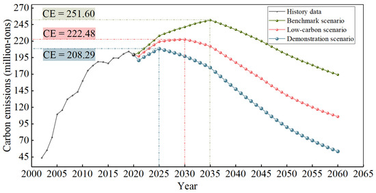 Based on the three scenario paths set above, the ARIMA-BPNN combination model is used to predict the carbon emissions of Suzhou City from 2021 to 2060. The CO2 trends in Suzhou under different scenarios are shown in Figure 9. The analysis of the carbon emissions in Suzhou under various scenarios is as follows.