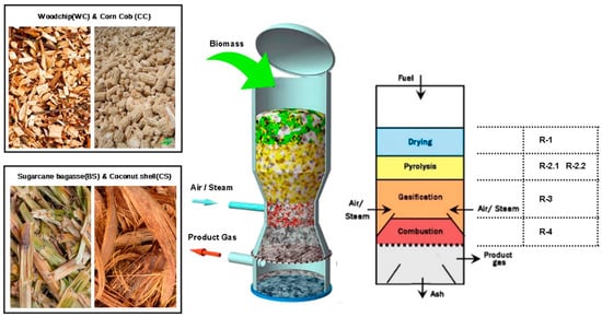 - Umeki, K.; Namioka, T.; Yoshikawa, K. Analysis of an updraft biomass gasifier with high temperature steam using a numerical model. Appl. Energy 2012, 90, 38–45. [Google Scholar] [CrossRef]