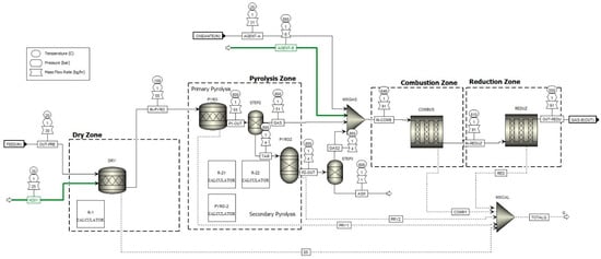 The gasification model for the combined forest and organic residue mixture was meticulously constructed and fine-tuned within the Aspen Plus simulator. This simulation platform enables a comprehensive evaluation of the model’s viability and allows us to elucidate crucial project parameters. These parameters encompass the proportions of the biomass mixture, the operational temperatures of diverse reactors, and an array of other key factors. The overarching objective is to optimize these conditions to achieve the highest quality gas output and maximize yield [,,,,].