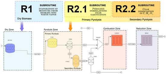 In the gasifier (Figure 3), after pretreatment of the feedstock, the different processes take place by controlling the humidification, represented by DRY, assisted by the R-1 calculator subroutine. Subsequently, the primary pyrolysis process begins, thus generating input data for the subsequent gasification model. After the drying step, a second reactor, specifically an RStoic reactor, seen in the pyrolysis zone, aided by the R-2.1 subroutine calculator, was introduced into the model to perform the primary pyrolysis step. The data needed for this reactor came from an Microsoft® Excel® for Microsoft 365 MSO (Version 2402)and Fortran R-2.1 subroutine, incorporated into the computational model, which is one of the great differences of this work, as this model is autonomous and easy to use, improving the prediction of the yield and elemental composition of pyrolytic products. Making use of only the data previously provided by the ultimate analysis and elementary analysis of the biomass used in the initial input process, making it a much more adaptive process to simulate other types of biomass and inductive when compared to other computational models used in the literature, in addition, this approach considers pyrolysis in two stages, increasing the precision of the results, as thermal cracking of the primary pyrolysis products is carried out, which can be considered as biomass that has not yet been converted, with three distinct species for tar (represented as a mixture of , , , and ) and ash. The percentage composition of each of these constituents is determined through meticulous adjustments to the mass balance performed by the subroutine. The empirical model designed for this purpose manifests itself as a system of linear equations, with key equations encompassed in Equations (1)–(13) [,] which were incorporated into these recursive subroutines: