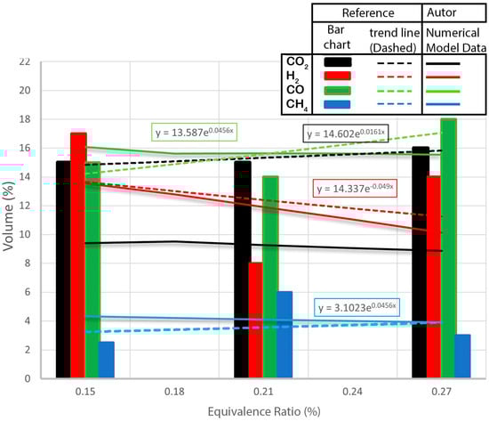 The estimated volumetric composition of the production gas was compared to the experimental results of Awais et al. [] in order to evaluate the accuracy of the suggested gasification model. When compared to the experimental data, Figure 5 shows that, overall, the suggested prediction model correctly predicts all gas components. Specifically, the prediction is in good agreement with small variances, and there are exact correlations between the and predictions.