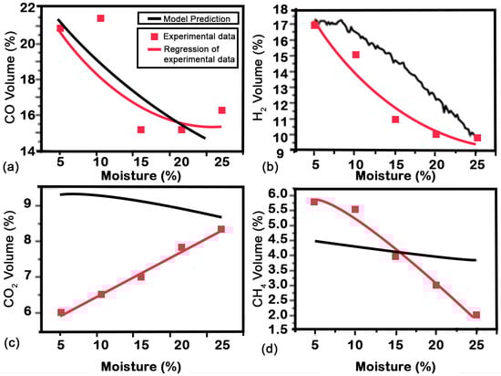In Figure 6, the influence of biomass moisture on the synthesis gas composition is illustrated. It is evident that an elevated moisture content introduces a higher concentration of into the system, primarily due to the presence of hydrogen in steam. In hydrogen production processes within biomass steam gasification, gasification temperature plays a critical role due to the endothermic nature of hydrogen production reactions, including the water–gas shift reaction ( + → + ), carbon gasification reactions (C + → + ), tar cracking reactions ( + → + ), and others. A higher gasification temperature is favorable for promoting hydrogen production [,,].